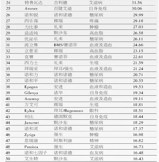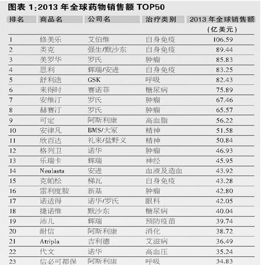 按照年銷售額10億美元的重磅藥物标準,2013年有近百種藥品達标,其中TOP50的達标線爲16.43億美元。